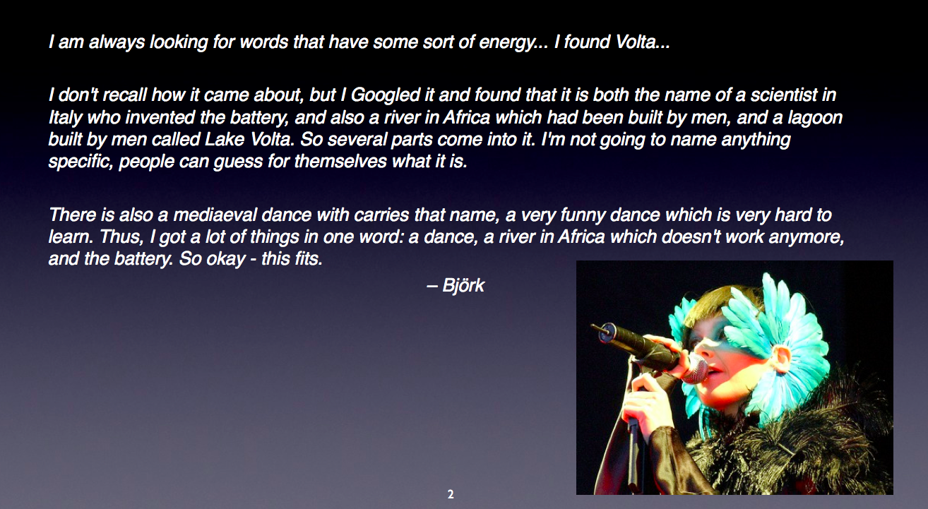 Passing up on Eat the Menu, I settled on “volta”.3 I liked the sense of electricity and energy, and, even better, I found an amazing quote from Björk explaining why she had chosen the name for the album. I’d start presentations at Intel about it with this slide:4
