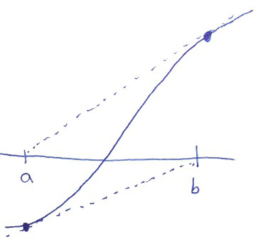 A rare state of affairs: we have a zero in the interval \([a,b]\), the derivative at \(a\) suggests that the zero is at exactly \(b\) and the derivative at \(b\) suggests it’s exactly at \(a\).