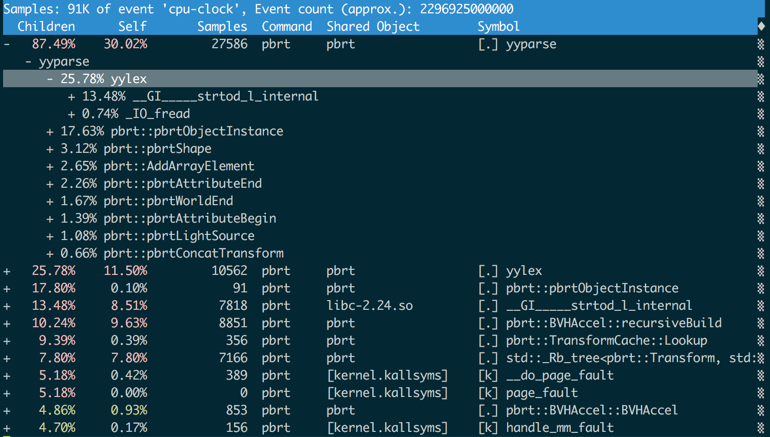 The first place I looked for insight was the statistics that pbrt dumps out after rendering. pbrt’s major phases of execution are instrumented so that rough profiling data can be gathered by recording what’s actually running at periodic interrupts during rendering. Unfortunately, the statistics didn’t explain much: of the nearly 35 minutes before rendering started, 4m 22s was reported to be spent building BVHs, but none of the rest of the time was accounted for in any further detail.