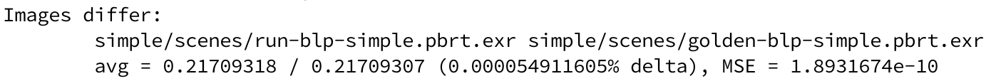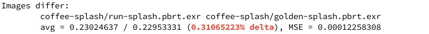 My testing script uses pbrt’s imgtool program to compare the output images to the golden images. It prints nothing when they match exactly, so if you’ve just changed the float parser, you might run the end-to-end tests, wait for them to finish, and move along happily if nothing is reported. When there is a discrepancy, imgtool’s output is like this: